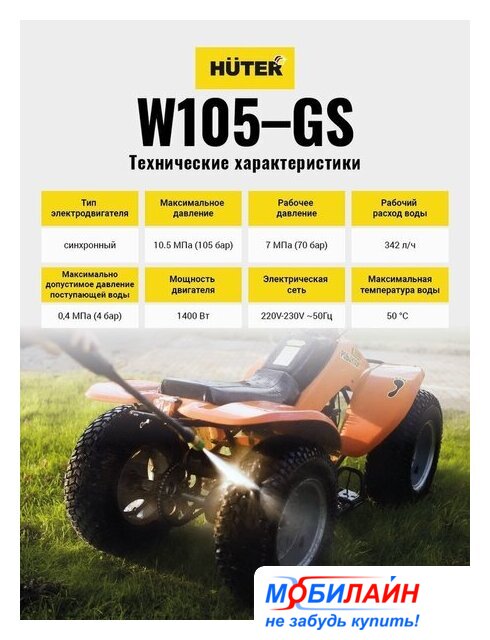 1200 Вт, 450 л/ч, максимальное рабочее давление: 70 Бар, максимальная температура на входе: 40 °C, длина шланга: 2.5 м