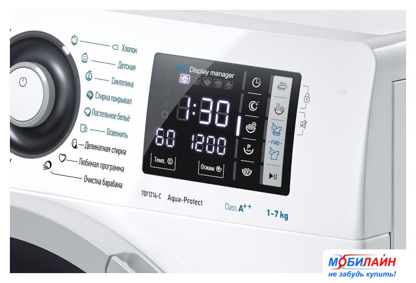 отдельностоящая, стиральная машина, с паром, загрузка до 7 кг, отжим 1200 об/мин, глубина 39 см (с люком 47 см), энергопотребление A, 15 программ