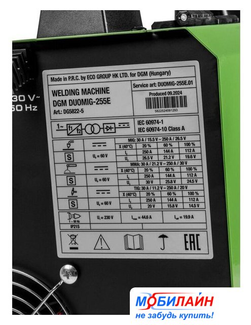 ручная дуговая сварка (MMA), входное напряжение 220 В, сварочный ток: 20-250 А, диаметр электрода: 1.6–5 мм, 5 кг