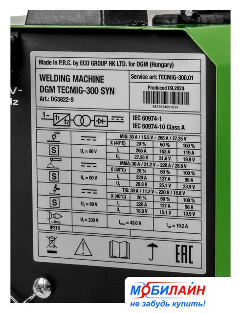 ручная дуговая сварка (MMA)/полуавтоматическая сварка (MIG MAG FCAW), входное напряжение 220–240 В, сварочный ток: 30–250 А, 6 кг