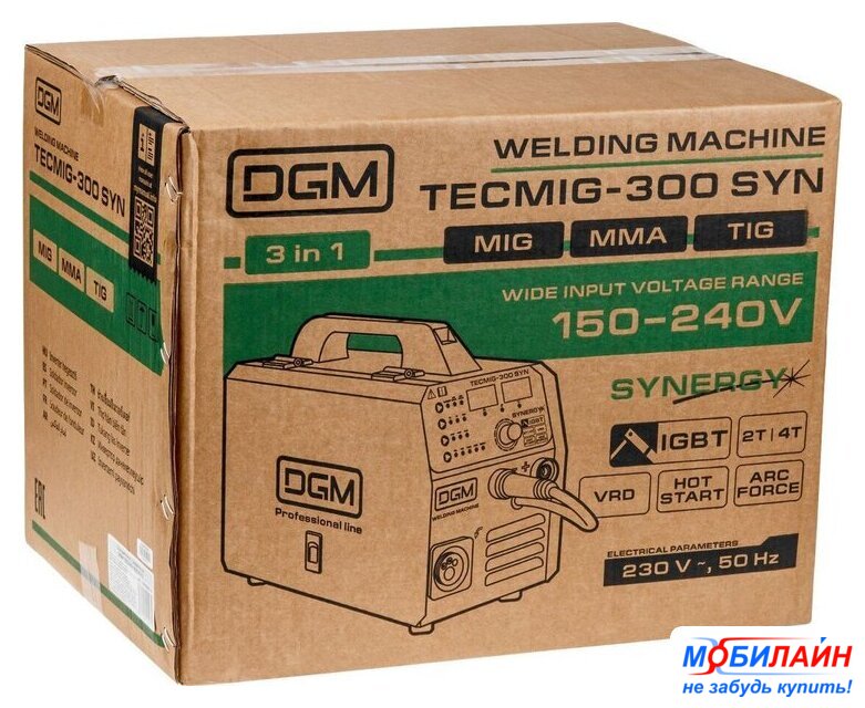 Комплект поставки | - Полуавтомат сварочный;- Горелка сварочная MIG - 3 метра;- Клемма заземления - 1,6 метра;- Электрододержатель MMA - 1,8 метра;- Контактный наконечник 0,8 мм. - 1 шт.;- Контактный наконечник 1,0 мм. - 1 шт.;- Руководство по эксплуатации. |