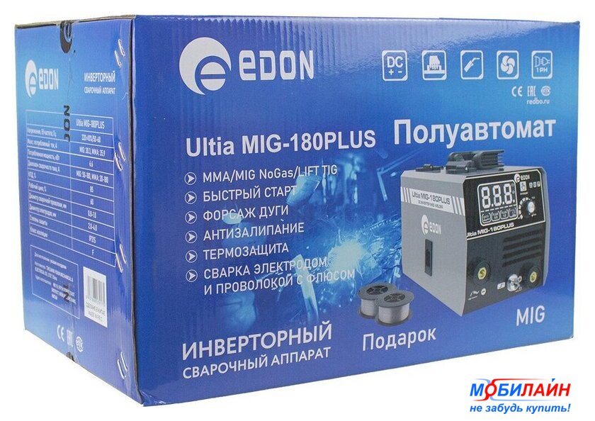 ручная дуговая сварка (MMA)/полуавтоматическая сварка (MIG MAG), 220 В, сварочный ток: 10–200 А, диаметр электрода: 0.6–5 мм, 14.35 кг