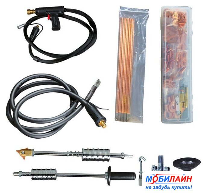 Комплект поставки | - Провод масса для точечной сварки (1 шт.), - Провод с пистолетом для сварки (1 шт.), - Обратный молоток для точечной сварки (1 шт.), - Ручной многофункциональный молоток для точечной сварки с треугольником (1 шт.), - Присоска ручная (1 шт.), - Шестигранный ключ (1 шт.), - Гребенка с 6-тью зацепами (1 шт.), - Крючок для обратного молотка (2 шт.), - Электрод угольный 350мм (5 шт.),- Электрод "треугольник" (10 шт.),- Кольца для вытягивания вмятин (10 шт.),- Шайба для вытягивания вмятин M4 (5 шт.), - Шайба для вытягивания вмятин M5 (5 шт.), - Шайба для вытягивания вмятин M6 (5 шт.), - Шпилька М4*20 (30 шт.), - Шпилька M5*20 (30 шт.), - Шпилька M6*20 (30 шт.), - Кольцо 12мм (15 шт.), - Кольцо 10мм (15 шт.), - Держатель электрода "треугольник" (1 шт.), - Точечный контактор – устройство крепления обратного кабеля (1 шт.), - Держатель угольного электрода (1 шт.), - Держатель круглых шайб (1 шт.), - Цанга для шпильки M4 (1 шт.), - Цанга для шпильки M5 (1 шт.), - Цанга для шпильки M6 (1 шт.), - Электрод точка для контактной сварки (1 шт.), - Электрод плоский для волнистой проволоки (1 шт.), - Волнистая проволока 32 мм (15 шт.) |