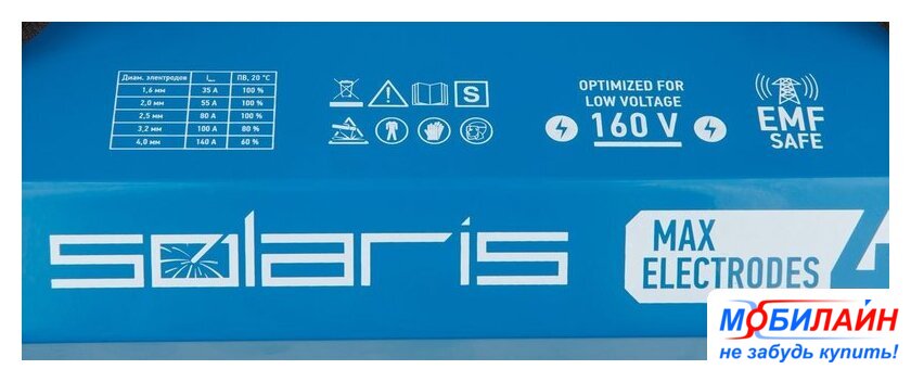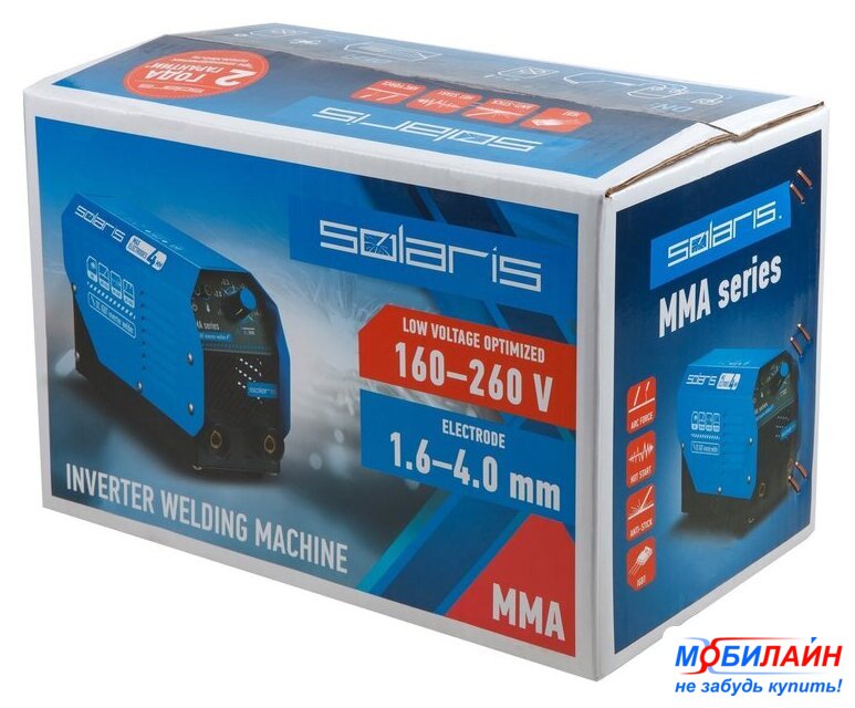 ручная дуговая сварка (MMA)/аргонодуговая сварка (TIG), входное напряжение 150–240 В, сварочный ток: 20–160 А, диаметр электрода: 1.6–4 мм, 3.56 кг
