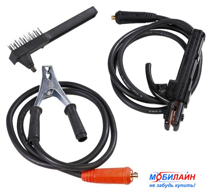 Комплект поставки | Рабочий кабель с электрододержателем, кабель заземления с клеммой, металлическая щетка, наплечный ремень |