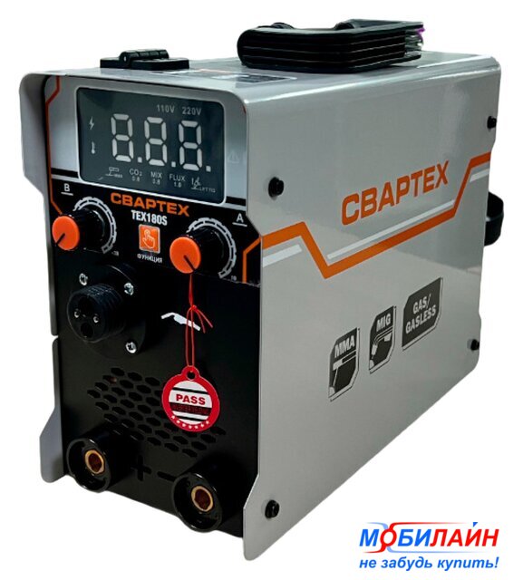 ручная дуговая сварка (MMA)/полуавтоматическая сварка (MIG MAG), входное напряжение 220 В, сварочный ток: 20–180 А, диаметр электрода: 1.6–4 мм, 10 кг