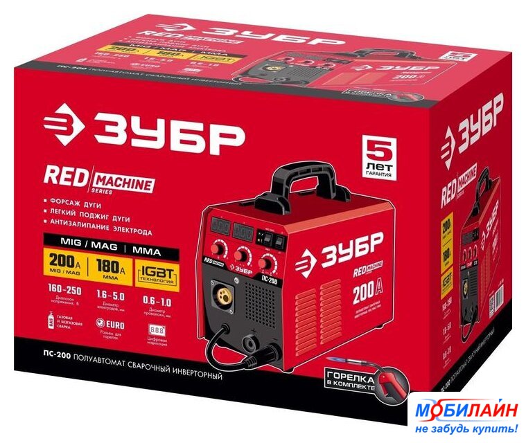 ручная дуговая сварка (MMA)/полуавтоматическая сварка (MIG MAG)/аргонодуговая сварка (TIG), 220 В, сварочный ток: 50–180 А, 8 кг