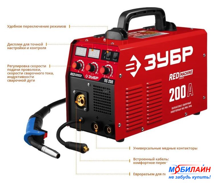 ручная дуговая сварка (MMA)/полуавтоматическая сварка (MIG MAG), 220 В, сварочный ток: 20–180 А, диаметр электрода: 1.6–4 мм, 14 кг