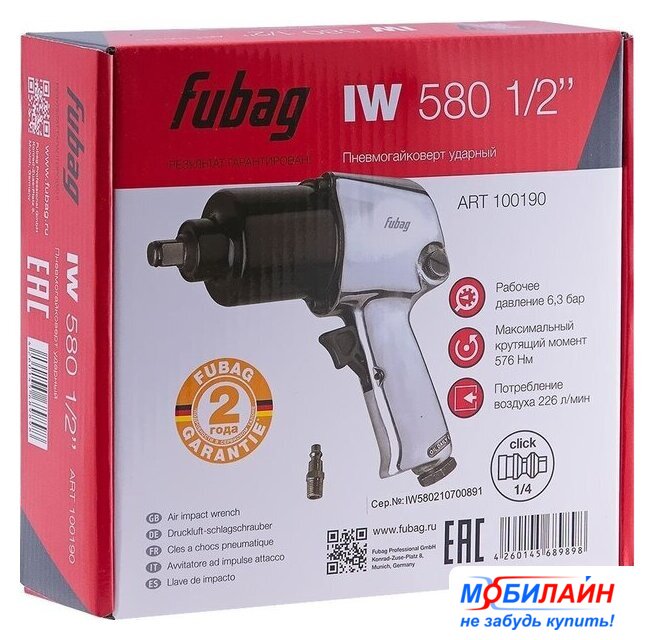 ударный, 576 Нм, 7000 об/мин, расход воздуха: 226 л/мин, давление: 6.3 бар