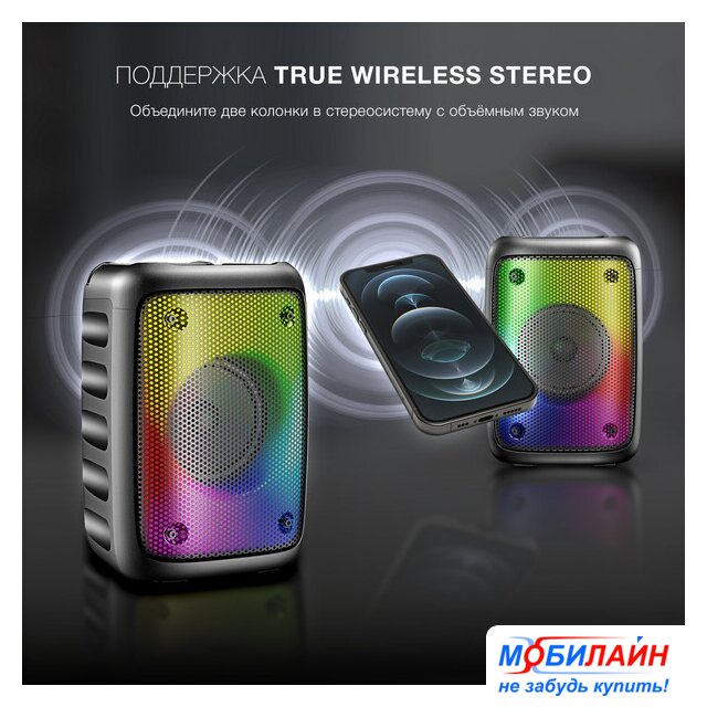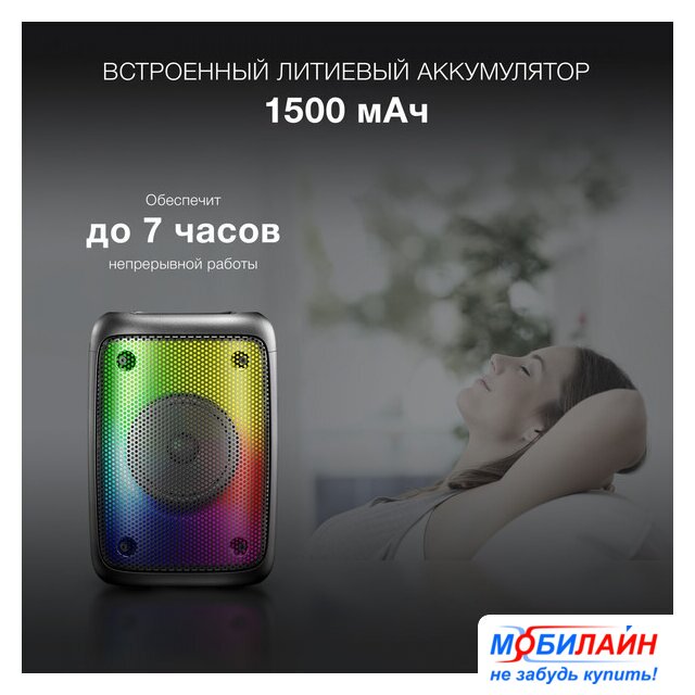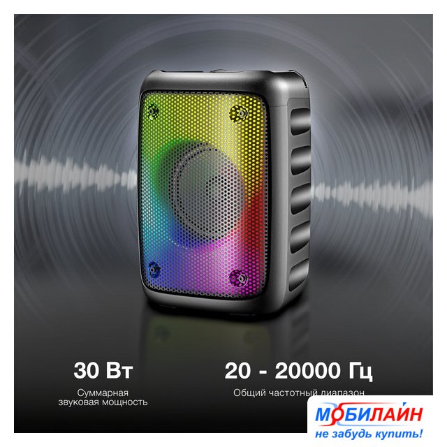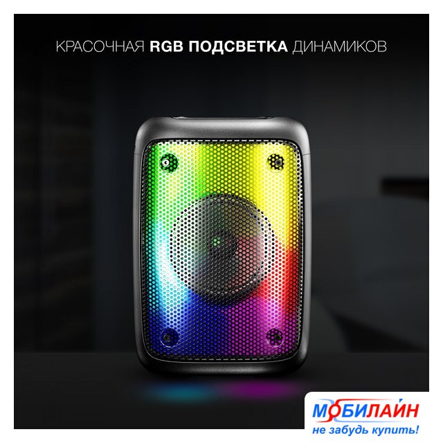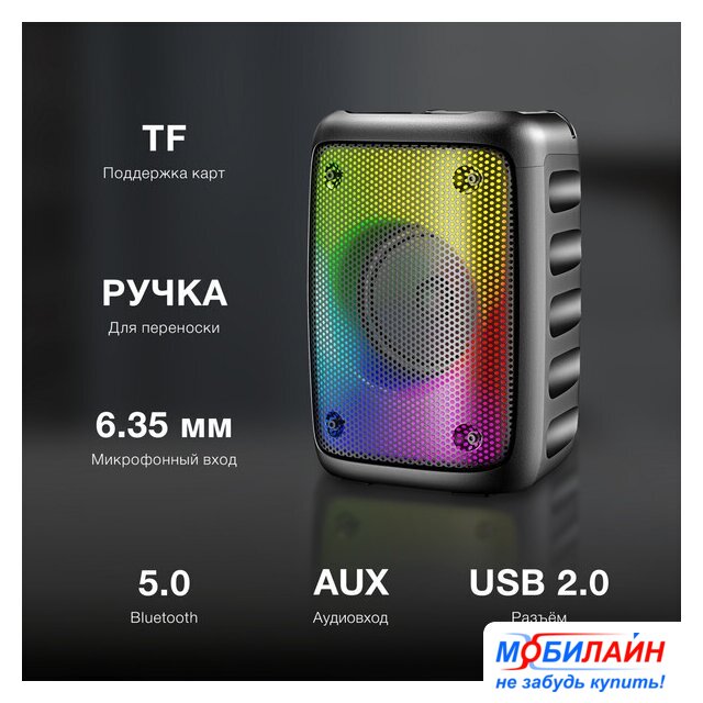 номинальная мощность 12 Вт, воспроизведение с USB, питание от аккумулятора, BT 5.1, AUX, время работы: 4 ч.