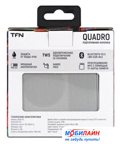 номинальная мощность 7 Вт, воспроизведение с microSD, питание от аккумулятора, BT 5.3, влагозащита IPX4, время работы: 9 ч.